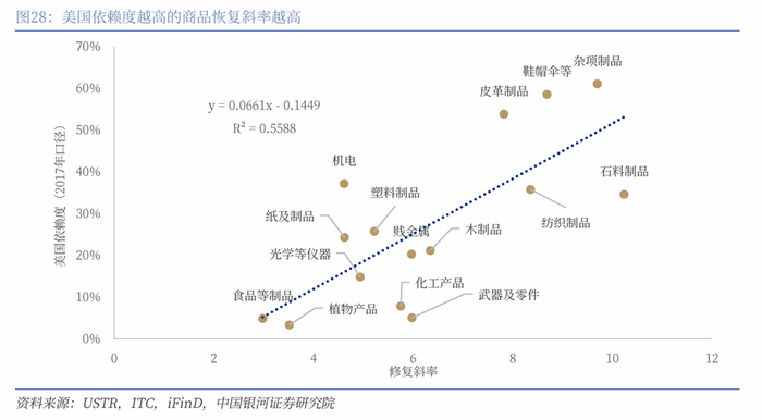进一步从商品依赖度来看,各类商品依赖度普遍下滑,加征新一轮关税覆盖率或有提高,出口恢复能力或进一步弱化。在关税、疫情及出口转移等多个因素的影响下,美国进口各类商品的对华依赖度普遍有所下滑,其中皮革制品、鞋帽伞等和机电降幅较大,分别为31%、17%和14%。仅有动植物油脂、艺术品、特殊交易品这三类商品的依赖度上升,其中艺术品、特殊交易品主要因为关税覆盖率低(特殊交易品未曾被加征关税),受关税影响较小,而动植物油脂则是由于前文分析的政策刺激和需求转移导致的。在商品依赖度普遍下滑的情况下,根据我们前文总结的结论,可以得出两个推断:(1)新一轮关税的覆盖率或有提高;(2)对美出口的恢复能力或有所弱化。但具体关税覆盖率情况还需关注美国关税相关政策的具体细则,而商品的恢复能力弱化则是因为原有需求的减弱,我们测算的6.02的恢复斜率或有所高估。因此,我国应该加快推进高水平对外开放,深度参与全球产业分工和合作,维护多元稳定的国际经贸关系和格局,促进我国出口增速平稳增长。