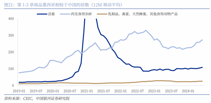 动物产品:从细分结构来看,墨西哥对中国拉开差距的商品主要集中于活畜、肉及食用杂碎、乳制品等。HS第1大类商品包含了99章中的1-5章,通过计算每一章美国自墨西哥进口和自中国进口的比值(为熨平波动,使用12月平均移动计算)来衡量墨西哥相较于中国的优势。可以看到优势主要集中在活畜、肉及食用杂碎、乳制品等三个章节,其中乳制品(乳制品、禽蛋、天然蜂蜜、其他食用动物产品)优势较为稳定,2019年初维持在50-70的倍数。而肉及食用杂碎则呈现出上升趋势,由2019年初的70倍上升至300倍左右的水平。活畜优势波动较大,2019年初保持在20倍左右的水平,2021年初由于春节等季节因素,美国自中国进口下滑,比值突破600,随后回落并最后稳定在100左右的水平。