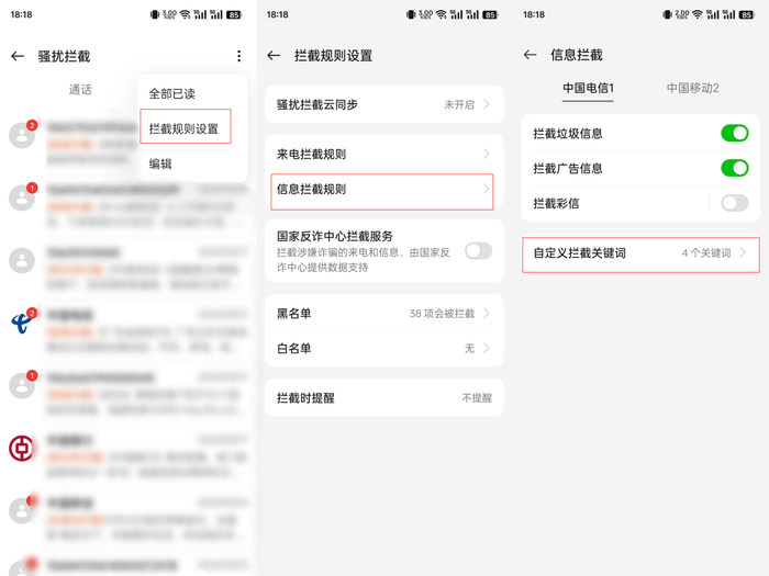 尽管你回复后大概率不会退订,但可以借此将「拒收」「回复」「退订」等关键词,放到拦截功能的黑名单里。