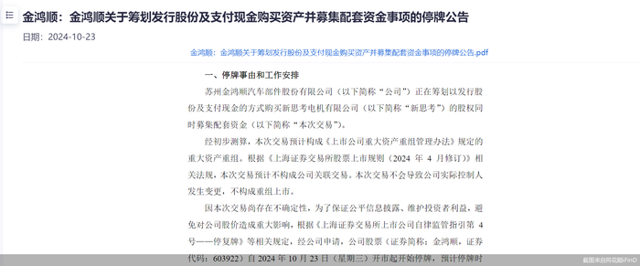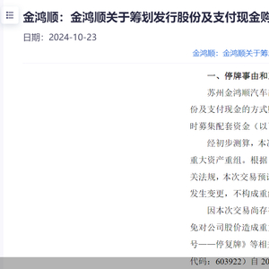 据金鸿顺披露的公告,公司正在筹划以发行股份及支付现金的方式购买新思考的股权,同时募集配套资金,公司股票自2024年10月23日开市起开始停牌,预计停牌时间不超过10个交易日。