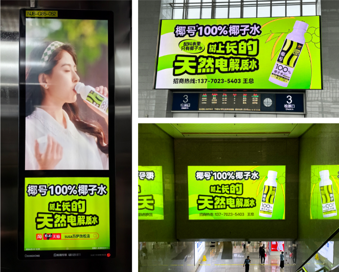 江苏、浙江、安徽三省高铁站,同样被“树上长的天然电解质水”霸屏,此外,苏萨椰号100%椰子水还成功登陆各大城市公交系统,为众多公交车披上了“椰号”牌新衣,成为穿梭在城市道路上流动的风景线。