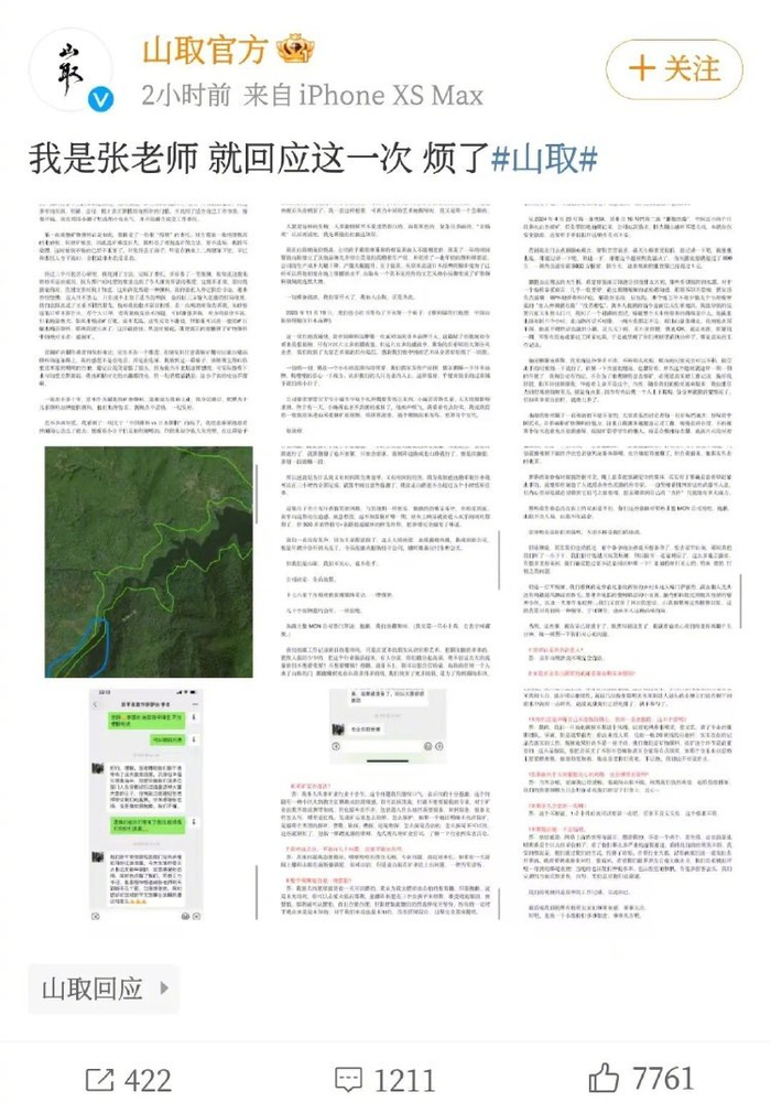 颜料师“山取”表示:“这么大的热度,连续上热搜,我们一直没有发声。因为我们是山取,我们不关心,也不在乎,公司决定全员放假,十七八家千万粉丝的新闻媒体采访,一律推掉;几十个品牌邀约合作,一律拒绝。”