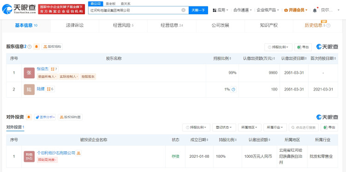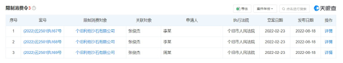 企查查显示,张俊杰当前关联有红河利他建设集团有限公司、云南观氏颜料有限公司等19家企业,其中15家企业已注销,4家为存续状态。值得一提的是,张俊杰名下涉及多则司法案件信息,并已被限制高消费,终本案件显示其未履行金额超89万元。而其持股51%的东莞市卡尼欧时装有限公司已被列为失信被执行人(老赖)。