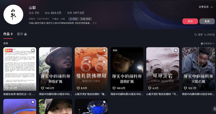 23日,上游新闻搜索该账号,还是可以顺利进入界面。颜料师“山取”账号界面显示的视频一共有9个,其抖音粉丝已超659万。