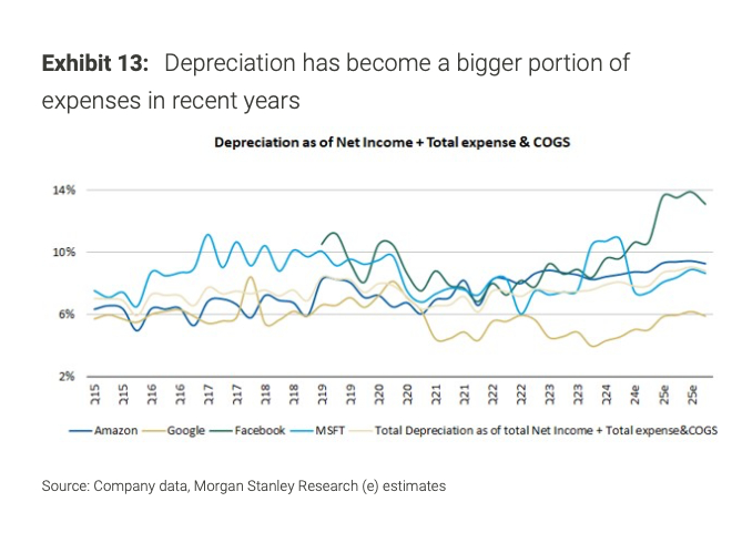 研报还分析了大型云服务提供商的折旧占总费用百分比。研报称,近年来,由于对数据中心的重度投资,数据中心客户的总费用中折旧的比例大幅上升,从2012年的3%到7%,上升到2023年的5%到10%。大摩预计,在美国前四大超大规模云计算公司增加资本支出的情况下,折旧将继续增长,预计到2025年将达到6%至14%。