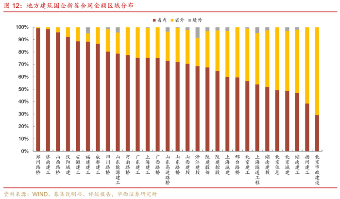从业务类型来看,地方国企主要从事区域内基建、房建等业务,近七成企业建筑施工业务占比在80%以上,但部分企业还从事房地产开发等其他业务,拉低了主业占比。结合营业收入和新签合同金额来看,陕建控股及陕建股份、北京城建、浙江建投、成都建工、四川华西集团的房建业务占比较高,在70%以上。而山东高速路桥及山东路桥、广西路桥、山西路桥、河南路桥等在区域内承担着重要的基建职能,基建业务占比在80%以上。