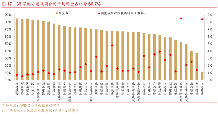 从两金占比来看,36家地方建筑国企的平均两金占比为66.7%,高于建筑央企(59.6%)。2023年末大部分地方国企两金占流动资产的比重在60%以上,其中陕建控股及陕建股份、邢台路桥、济南建工、汉阳城建的两金占比在80%以上,且调整后应收账款周转率小于1,周转效率有待提高。