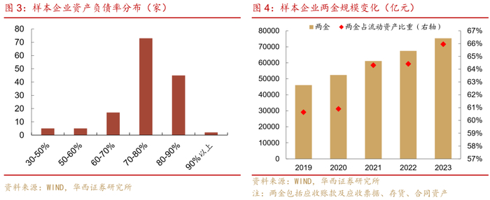 从运营模式来看,建筑行业竞争激烈,垫资施工现象较为普遍,行业整体处于高杠杆运营状态。建筑类项目回款一般采用工程进度款模式,回款周期较长。此外,企业需要对已完工项目提供质保,质保期大多为2-5年,“两金”高企成为困扰建筑企业的一大难题。以近5年均披露了财务数据的147家建筑发债主体为样本,2023年八成企业资产负债率在70-90%之间,两金规模合计达7.5万亿元,同比增长11.7%,占流动资产的比重从2019年的60.6%增长到2023年的66.0%。