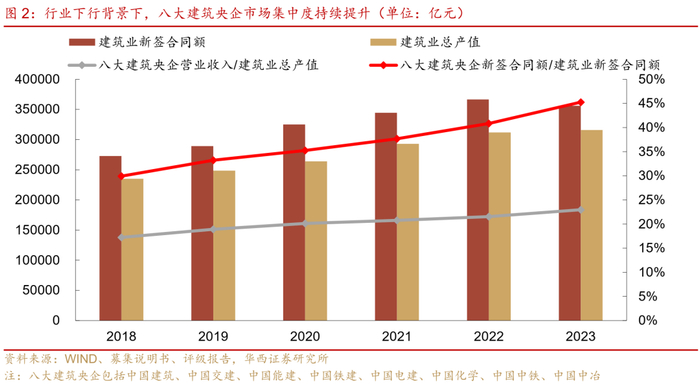 在下游基建需求低迷、地产需求仍弱的背景下,建筑行业逐步迈入低速增长区间,八大建筑央企市场占有率持续提升。2023年建筑业总产值为31.6万亿元,同比增速为5.8%,较2022年下降0.7个百分点;新签合同金额35.6万亿元,同比减少2.8%。我国建筑企业数量众多,行业低速增长下建筑企业间的竞争将进一步加剧,建筑央企市场占有率持续提升。2018-2023年,八大建筑央企营业收入占建筑业总产值的比重从17.2%增长到23.0%,新签合同额占比也从29.9%增长到45.3%。