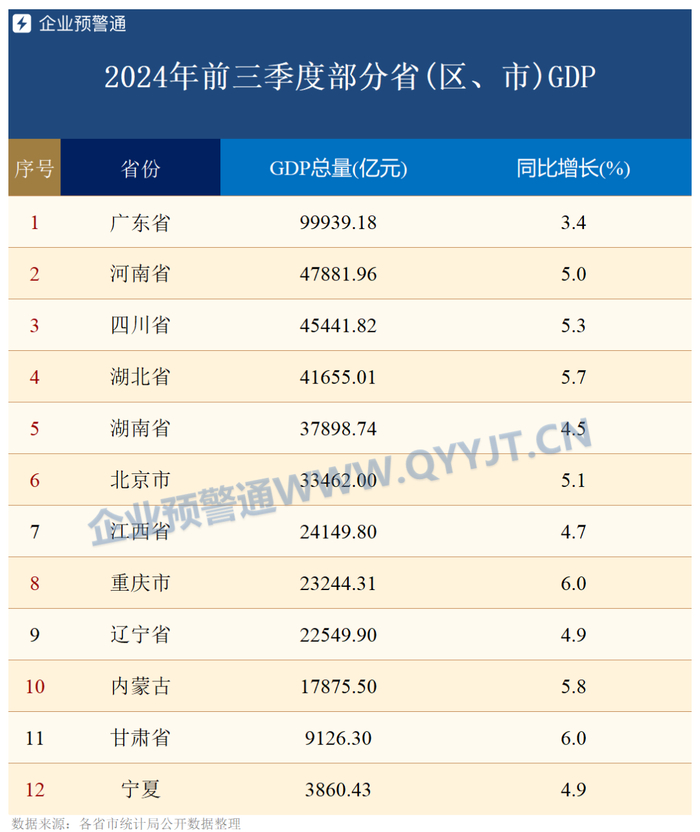 据企业预警通统计,截至目前,已有12省市公布了2024年前三季度GDP数据,从总量上看,经济第一大省广东遥遥领先,GDP总量接近10万亿;河南、四川、湖北均超过4万亿;湖南、北京超过3万亿;江西、重庆、辽宁超过2万亿。