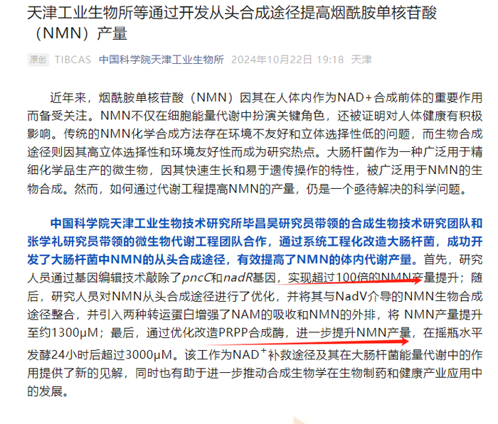 报道称,天津工业生物技术研究所通过系统工程化改造大肠杆菌,成功开发了大肠杆菌中NMN的从头合成途径,有效提高了NMN的体内代谢产量。