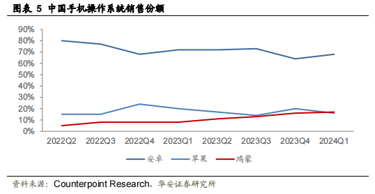 2) 2024 年一季度,手机鸿蒙操作系统中国的市占率达到 17%,成为中国第二大手机操作系统。