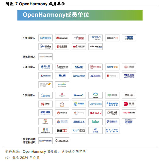 从 OpenHarmony 来看,主要的合作伙伴包括 OpenHarmony 成员单位。具体划分为 A 类捐献人、特殊捐献人、B 类捐献人、C 类捐献人、学术机构和非盈利组织。