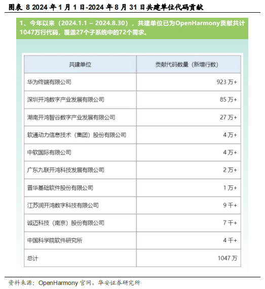 根据 OpenHarmony 运营报告,2024 年 1 月 1 日-8 月 31 日止,贡献代码数量前五的共建单位分别为:华为、深开鸿、开鸿智谷、软通动力、中软国际。