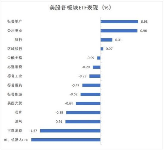 美股行业ETF收盘多数下跌。公用事业ETF涨近1%,全球航空业ETF涨不足0.5%。而可选消费ETF、网络股指数ETF及全球科技股ETF均跌超1.5%,科技行业ETF、生物科技指数ETF及半导体ETF各跌至少1%,能源业ETF及医疗业ETF各跌约0.5%。