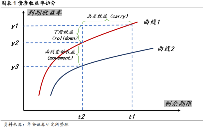 债券投资的收益主要由两部分构成,即息差收益+资本利得。根据Campisi模型,所有投资的收益都可以表示为持有期间的票息收入和持有期内的资本利得。其中,持有期间的票息收入包括债券票息和杠杆带来的息差;持有期内的资本利得包括债券久期缩短下滑收益和收益率曲线变化带来的曲线变动收益。