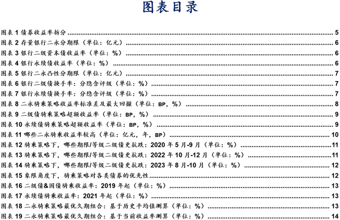 对于二永骑乘,存在两点常见误区。一是债市回调,二永仍可获取超额收益。我们回测发现,在基本面主导+利差保护较高的情形下,二永骑乘的抗跌性较好,如2020年5月;低利率环境下二永存在信用保护不足、票息不足以弥补资本利得损失,如2023年8月,该轮回调国债表现>永续债>二级债;机构行为面带来的债市快速回调一般国债表现较好,其次为二级债与永续债,如2022年10月。二是二永骑乘,久期并非越长越好。我们以历史数据测算发现,在3年久期限制下,对于AAA-/AA+级二级债,在3年久期限制下配置50%的2年期、50%的4年债券的收益率最高;对于AA级二级债,配置3年期债券收益率最高。若以当前收益率测算,二级债最优的骑乘策略组合为80%的2年期债券、20%的7年期债券。