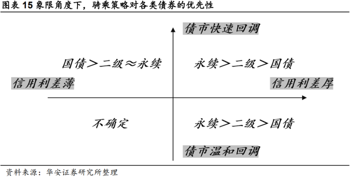 借鉴债市回调的历史数据,我们能从象限的角度判断不同债市环境下是否做骑乘、用哪一类债券做骑乘。二永骑乘策略的收益率性价比即为信用利差与资本利得之间的平衡,存在四种情况:①信用利差厚、债市快速回调,二永占优,收益率高于国债,②信用利差厚、债市温和回调,二永占优,收益率高于国债,③信用利差薄,债市快速回调,国债占优,收益率高于二永,④信用利差薄,债市温和回调,收益率情况不确定。在债市下行阶段,骑乘策略中永续>二级>国债。