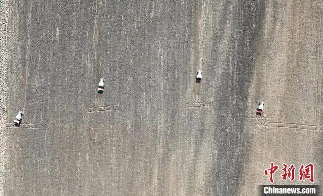 10月22日,河北雄安新区安新县端村镇关城二村一农田内,几台“鸿鹄T70”电动智能拖拉机正在进行秋播作业。(无人机照片)中新社记者 韩冰 摄