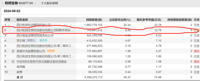 截至8月2日,和邦生物回购专项账户的持股数为7.44亿股,占比达到8.42%。不断回购也加剧了公司资金紧张,其短期借款、一年内到期的流动负债及长期借款合计金额,从2024年期初的19.45亿元增加至33.25亿元。