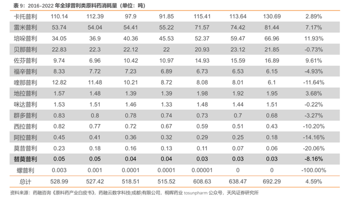 普利类原料药消耗总体较为稳定,培哚普利表现突出。2022年普利类原料药全球总消耗量为692.29吨,2016-2022年期间年复合增长率达4.59%。其中总消耗量最大的品种为依那普利(2022年消耗量195.53吨);消耗量增速最高的品种为培哚普利,2016-2022年期间年复合增长率达11.93%;莫昔普利、西拉普利、喹那普利等多个品种的消耗量已呈现萎缩状态。培哚普利近年销售额迅速增长并远超其他普利类品种,药融咨询分析师推测与精氨酸培哚普利片和精氨酸培哚普利氨氯地平片两个改良制剂的市场崛起有关。(来源:药融云数字科技(成都)有限公司)