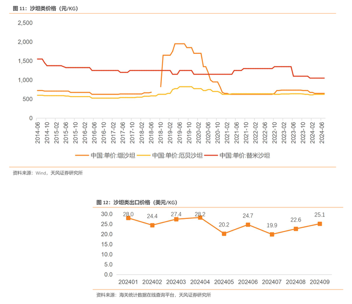 原料药行业受供需关系影响呈现周期性。受2018年基因毒性杂质事件影响,原料药供需关系急剧变化,导致价格抬升,尤其是缬沙坦出现价格明显失调。而后受地缘政治、经济环境、行业竞争等因素影响,沙坦价格呈现下降趋势,目前整体处于去库存阶段,价格处于周期的底部区域。截至2024年7月底,厄贝沙坦、缬沙坦和替米沙坦价格相较去年1月价格分别-1.6%、-11.6%、-22.2%,绝对值均处于历史相对低位水平。同时,海关数据显示,2024年7-9月沙坦类出口价格连续三个月回升,初步显示出企稳回升的信号。