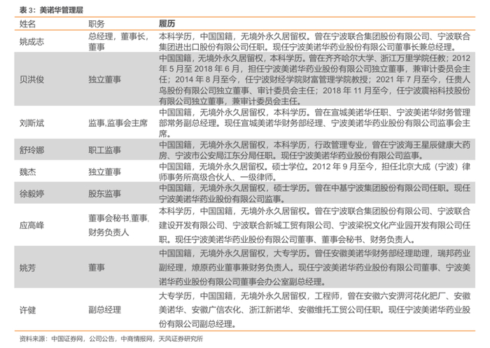 公司管理层资质经验丰富,保障公司稳定持续发展。公司现任董事长姚成志、副总经理许健、独立董事贝洪俊等在医药行业具备多年的工作管理经验。董监高管团队中,多位高管具备在审计、财务、合规等方面的丰富经验,各司其职,助力公司发展。