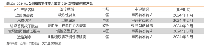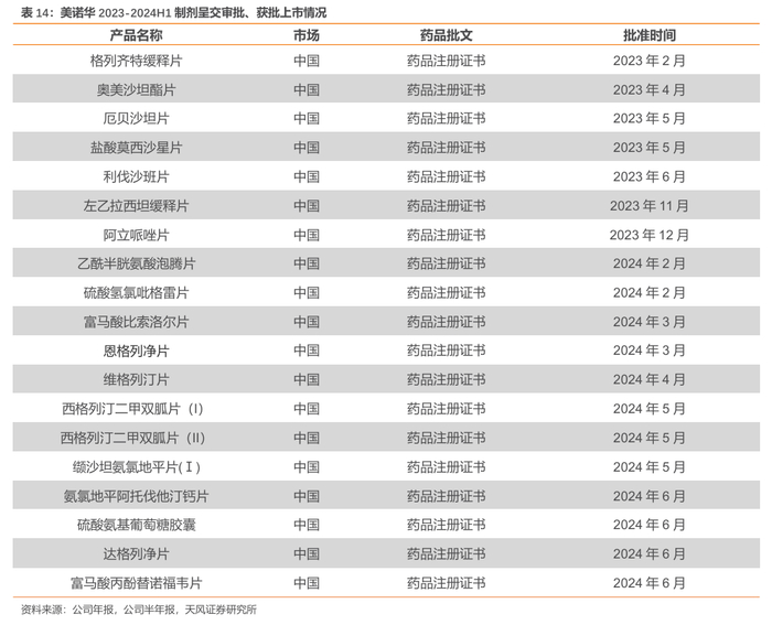 制剂品种获批加速,在研管线数量丰富。2023年制剂全年累计在研项目超50个,其中21个项目为新立项产品。截至2023年底,14个项目在小试阶段,9个项目在中试阶段,9个项目完成验证生产,6个项目完成BE试验且一次等效,13个项目递交CDE进入审评阶段,9个品规获批生产进入商业化。2023年1月1日至2023年12月31日内,公司制剂产品获批上市共计7个。截至2024年6月30日,另有乙酰半胱氨酸泡腾片、恩格列净片、维格列汀片等12个制剂产品获批上市。公司累计已有34个制剂产品在国内获批上市。