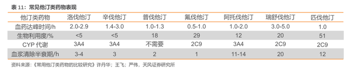 不同他汀类药品各自药物特点不同,公司主要品种竞争力强。目前最常用的他汀类药物主要有七种:洛伐他汀、辛伐他汀、氟伐他汀、普伐他汀、阿托伐他汀、瑞舒伐他汀和匹伐他汀,其在血药达峰时间、生物利用度、CYP 代谢以及血浆清除半衰期等方面均存在不同,医生应结合患者的LDL-C水平、血糖情况、肝肾功能、药物联用、个体用药敏感度和基础疾病等因素综合考量。综合来看,瑞舒伐他汀和阿托伐他汀半衰期较长,可在一天内的任何时间一次服用,患者依从性较高;两者生物利用度均较高,分别为20%和12%,且阿托伐他汀在血药达峰时间上具备优势。因此,从药物本身角度出发,公司的主要品种瑞舒伐他汀和阿托伐他汀存在较强竞争力。