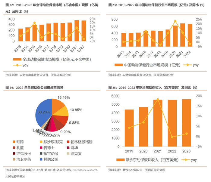 动保市场稳步扩张。根据农财宝典畜牧版公众号数据,2022年全球动物保健市场(不含中国)规模约375亿美元,2013-2022年期间年复合增长率CAGR达5.58%;中国动物保健行业市场规模达673亿元,2013-2022年期间年复合增长率CAGR达5.89%。从竞争格局来看,默沙东是全球第二大动保公司,2022年默沙东占全球动保市场份额约10.85%,2023年默沙东动保收入为56.25亿美元(yoy+1.35%),有望持续享受动保市场的成长红利。因此我们预测公司CDMO业务也有较大机会在与默沙东的合作中长期受益,承接更多默沙东的订单。