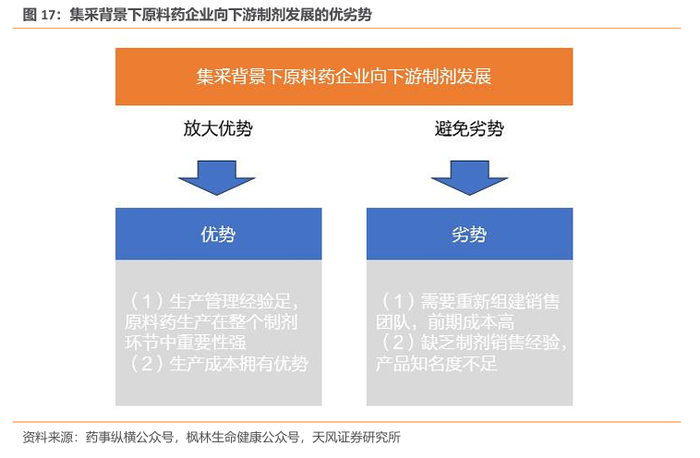 集采背景有助于原料药企业向下游延申。根据医药魔方Info公众号,考虑到:(1)原料药企业拥有生产成本优势;(2)原料药企业有能力通过限价的方式影响其他企业的策略。在集采持续扩面的背景下,原料药企业上游优势将持续放大,有利于向制剂端持续突破。目前,原料药企业制剂收入占比普遍较低,国内部分原料药龙头企业制剂端2019年收入几乎为零。在带量集采的背景下,预计原料药企业的生产和成本优势将逐渐放大。
