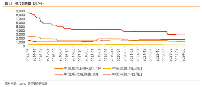 他汀类药品价格有望止跌企稳。随着国家药品带量集采政策的实施,截至第九轮集采,共有5个他汀类药物进入了药品集采目录,药品的价格也有了大幅的下降。据智研咨询统计,国内他汀类药物市场价格从2018年的2.32元/10mg/片下降至2022年的0.77元/10mg/片。截至2024年7月底,阿托伐他汀钙、洛伐他汀和氟伐他汀钠价格同比上相较去年1月价格分别-18.03%、-32.35%、-22.67%,绝对值均处于历史相对低位水平。未来,伴随着集采带来的价格波动趋于平缓,他汀类药物价格有望止跌企稳。