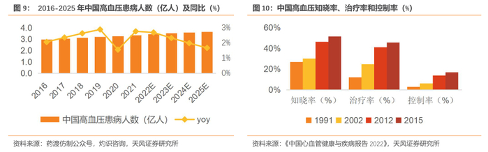 我国高血压患病率逐年增加。据国家心血管病中心发布的《中国心血管健康与疾病报告2022》统计,我国高血压病现患人数2.45亿,患病率为27.9%。而根据灼识咨询的数据,中国高血压患病人数由2016年的2.97亿人增长至2021年的3.35亿人,年均增长率约为2.44%。