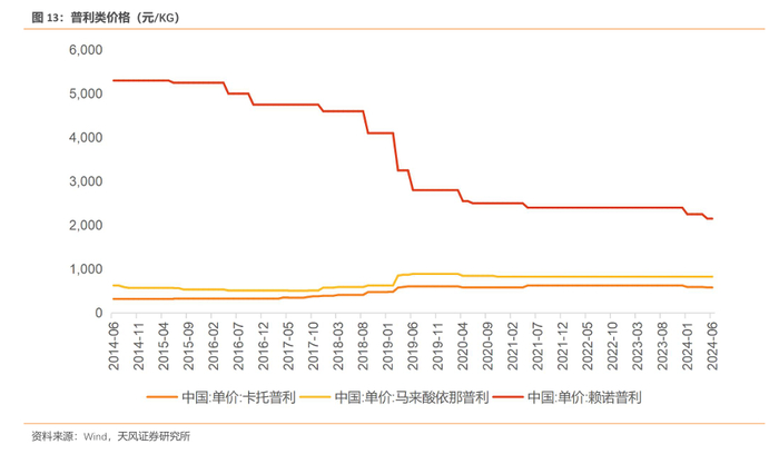 普利类药品价格稳定,价格有望回升。普利类药品使用成熟,价格几年维持稳定,处于历史上较低位置。虽然以沙坦、普利为代表的全球特色原料药面临去库存压力,价格处于低位;随着心血管类、抗肿瘤类、中枢神经类、胃肠消化道类等特色原料药市场需求持续扩大,相关价格有望企稳回升。