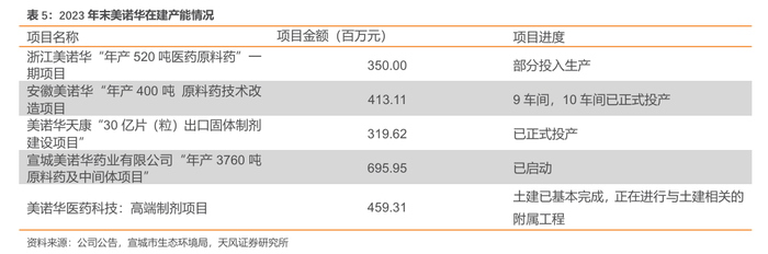 公司产能储备充足,三地新产能正式投入使用。截至2023年12月31日,安徽美诺华、浙江美诺华、宣城美诺华三大原料药生产基地产能共计约1600吨/年,美诺华天康产能为45 亿片/年。2023年公司积极布局原料药产能扩建,安徽美诺华“年产400吨原料药技术改造项目”9车间、10车间已正式投产;浙江美诺华“年产520吨原料药”项目部分已投产;美诺华天康“30亿片(粒)出口固体制剂建设项目”车间已正式投产;宣城美诺华二期扩建项目已启动。出于公司自身产能结构优化、加速战略升级转型需求考虑,公司于2022年10月13日将持有的燎原药业的全部股权(约占标的公司股份总额的84.5661%)转让给济民可信投资。在燎原药业剥离完成后,公司新老产能无缝衔接,为API制剂一体化战略提供产能保证。