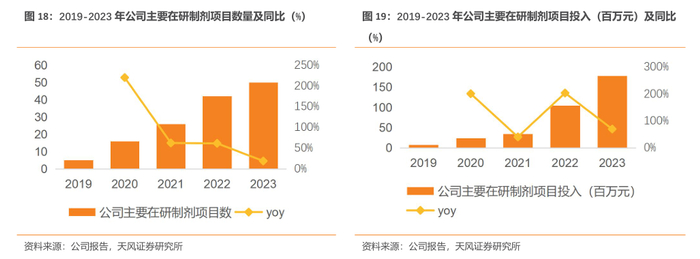 制剂业务投入加大,研发布局加速。公司持续加大在自研制剂方面的投入,主要在研制剂项目数量由2019年的5个增长至2023年的50个,年复合增长率达77.82%;同时制剂研发投入也持续提高,公司主要在研制剂项目投入由2019年的814.72万元增长至2023年的1.78 亿元,主要在研制剂项目平均投入由162.94万元增长至356.17万元。