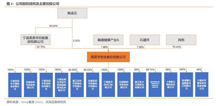 股权结构稳定,激励机制高效。截至2024H1, 姚成志先生为美诺华药业股份有限公司实际控制人。姚成志先生直接持有公司5.52%的股份,并通过持有宁波美诺华控股集团有限公司90%的股份间接持有公司18.63%的股份,总持股比例为24.15%,公司股权结构稳定。