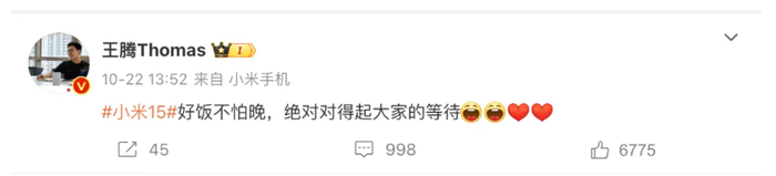 小米公司王腾此前曾在社交媒体上表示:“好饭不怕晚,小米15绝对对得起大家的等待。”