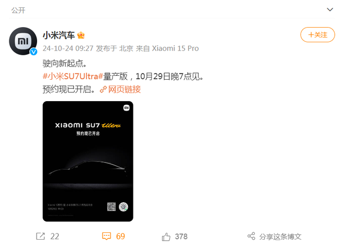 此外,雷军还在微博中表示,小米SU7 Ultra量产版也将在10月29日发布。据悉,小米SU7 Ultra是小米汽车推出的一款高性能纯电动车型。此前,小米曾发布了小米SU7 Ultra原型车。
