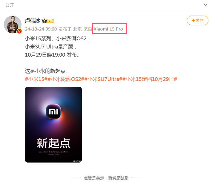 同日,小米集团合伙人、总裁卢伟冰也发布微博称,小米15系列、小米澎湃OS2、小米SU7 Ultra量产版将于10月29日晚7点发布,“这是小米新的起点”。