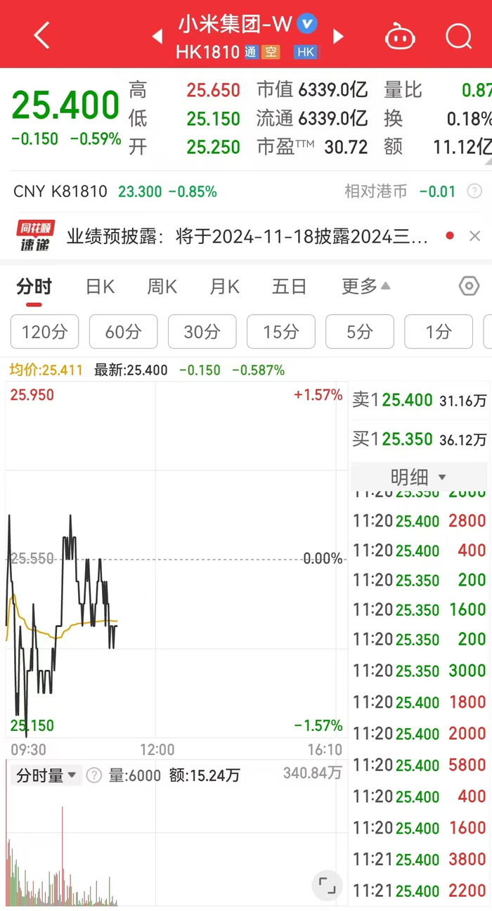 截至10月24日发稿,小米集团(HK1810)报25.4港元,跌幅0.59%,市值6339亿港元。