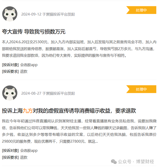 此外,九方智投的业务还面临合规方面的挑战。其通过大量MCN矩阵账号获客的方式频遭诟病,频繁因为存在误导性宣传,过度推销骚扰用户被投诉。例如,在黑猫投诉平台上,此类内容频频出现。