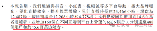 有了流量,九方智投积极采取行动。截至2024年6约30日,集团在多个互联网平台上运营的MCN账户达到了488个,较年初增加了160个;粉丝数量约4560万,较年初增长了约1460万。意味着公司的流量矩阵正在不断扩大。