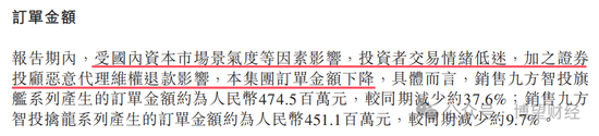 数据显示,九方智投上半年订单金额为9.31亿元,同比下滑26.17%。公司将原因归结为受国内资本市场景气度等因素影响,投资者交易情绪低迷,加之证券投顾恶意代理维权退款影响。