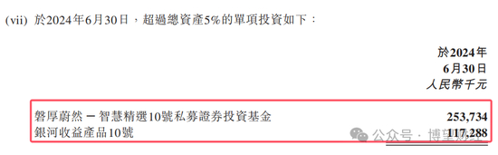 其中,截至2024年6月30日,九方智投有两笔超过总资产5%的单项投资,分别为磐厚蔚然-智慧精选10号私募证券投资基金和银河收益产品10号。