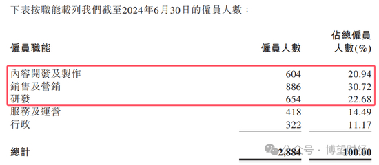 进一步的,九方智投还“为不断扩大的业务”新招聘了百余名员工。截至2024年6月底,公司员工总数为2884人。其中,从事内容开发及制作的员工共604人,占总员工数的20.94%;从事销售及营销的员工数为886人,占比30.72%销售及营销的员工数为886人,占比30.72%;研发人员为654人,占比22.68%。