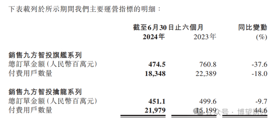 然而,结果却并未能如愿,九方智投正面临着严峻的考验。2024年上半年,公司的旗舰系列产品付费用户减少4041人,订单金额下降至4.75亿元,同比下降37.6%;为专业投资者打造的擒龙系列产品,尽管付费用户数增长6780人,订单金额却下降至4.51亿元,同比下降近10%。