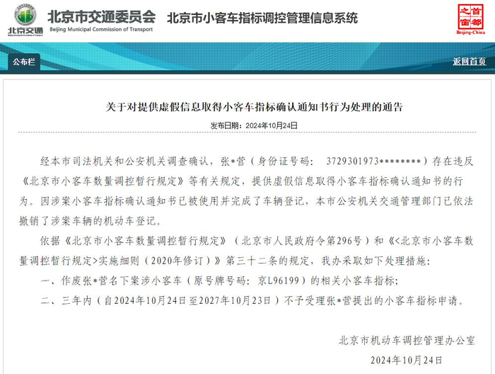 提供虚假信息、违反规定,北京公告涉案小客车指标作废 三年不受理申请