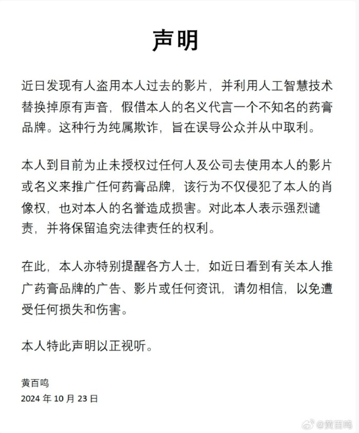 声明中称,强烈谴责了某些不法分子盗用他的影片并利用人工智能技术替换声音,冒充他为某不知名品牌药膏代言的行为。这种行为不仅侵犯了他的肖像权和名誉权,还误导了公众,造成了严重的负面影响。