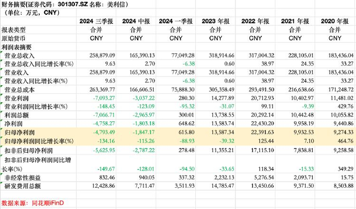 据同花顺iFind盈利预测,2024年全年美利信归母净利润同比继续下降,降幅约为22%。